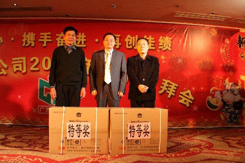 春節團拜會(huì )上公司董事長(cháng)黃鼎龍(中)給抽中特等獎的員工發(fā)獎并合影留念
